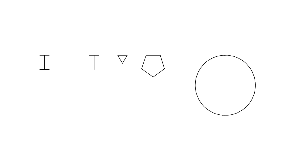 Code to create an intuitively-drawn I and T, as well as triangle, pentagon, and circle (i.e., any polygon) can be found here. Below are the images generated from running the above.